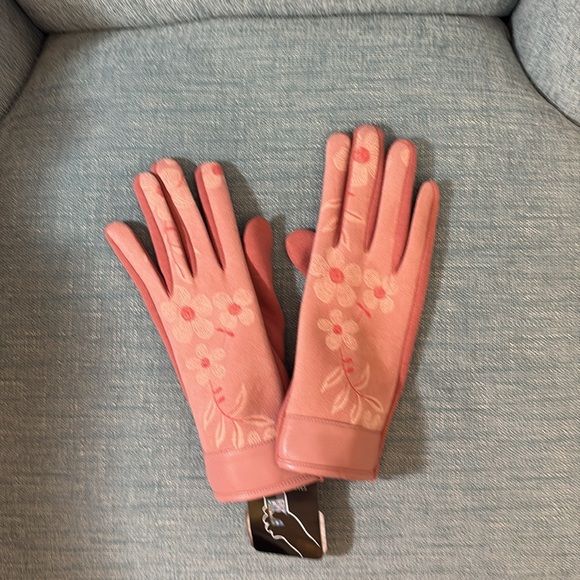 Elegant pink gloves with floral design. Tech-friendly fingertips for easy smartphone use.