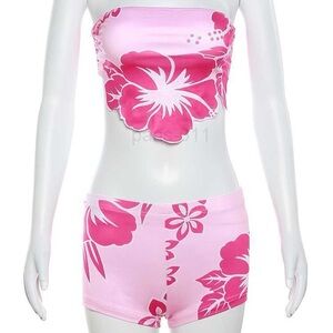 Stylish pink two-piece set with bold floral design. Perfect for summer outings.
