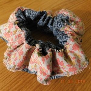 Handmade by me with recycled materials NWT shabby chic boho floral gypsy cute pink white and green hand fringed strip on denim hair tie/ scrunchie