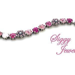 An assortment of sparkly pink Swarovski crystals in 8mm along with two flower embellishments make up this cute and feminine tennis bracelet. The bracelet is shown in antique silver and is also available in other popular finishes.