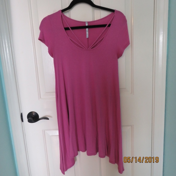 Dull pink, straps on front, longer on right and left sides, thin cotton material