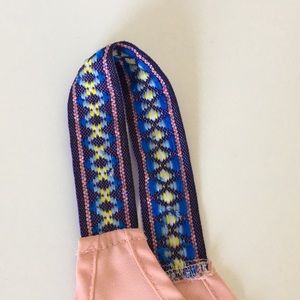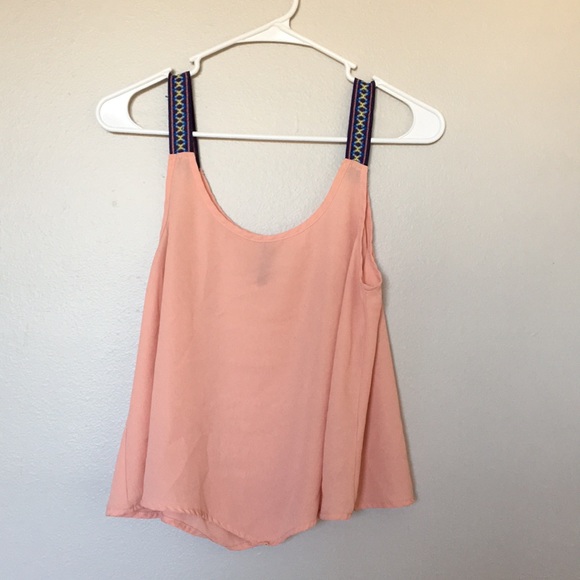 Pink flowy tank top with blue, yellow, and purple design at the shoulder. Size S.
