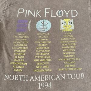 Brown Pink Floyd graphic band tee featuring The Division Bell artwork on the front and 1994 North American Tour cities on the back. 100% cotton, soft worn-in feel, classic rock band style. Short sleeve crewneck. Authentic licensed graphic tag printed inside. Perfect for fans, collectors, or grunge streetwear outfits.