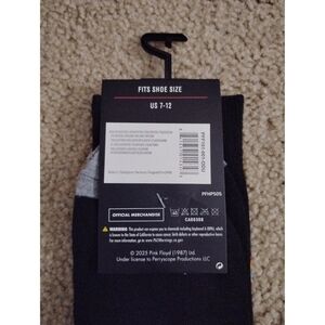 These are brand-new, officially licensed Pink Floyd crew socks, featuring the iconic "Dark Side of the Moon" album artwork. The socks are primarily black with a graphic on the front of the album's famous prism and rainbow light beam. The band's name, "Pink Floyd," is printed in white above and below the design.