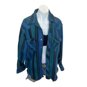 Relaxed boyfriend style comfy flannel Blue plaid, with heavy shacket flannel. Pink Floyd concert poster graphic on the back. Western pearl snap flannel. Unique one of a kind upcycled Flannel. Repaired flaw see details below