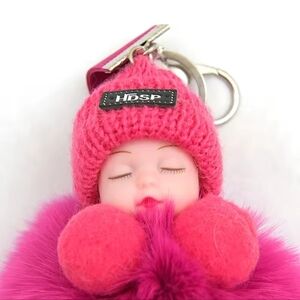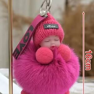 Charming pink keychain with fluffy pom-pom. Features a cute doll design. Perfect for bags or keys.