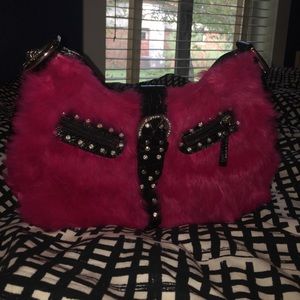 Pink fur in front with buckle, has zippers on outside and inside. Small, but cute handbag.