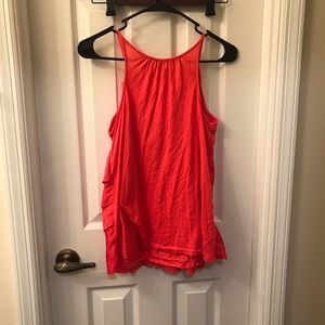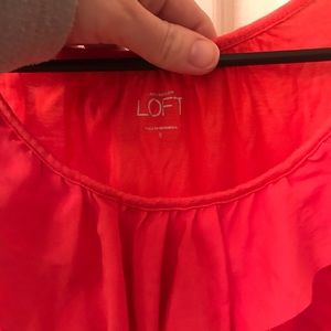 Pink layered flutter blouse, solid pink back. Loft size XS. Minor signs of wash/wear