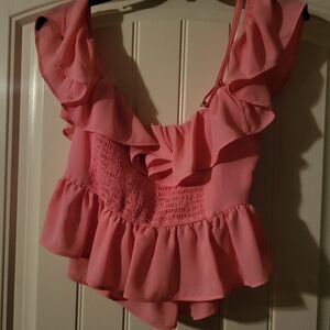 This charming blouse features flutter sleeves and a tiered ruffle design, all in a soft pink hue. The lightweight fabric drapes beautifully, adding a touch of elegance to any outfit.