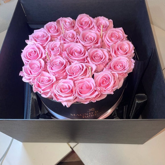 Beautiful pink forever roses by magnificent roses. Still in original box never taken out. Great for gifting or decoration