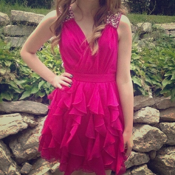 Worn once and dry cleaned. Fun, ruffled formal dress. There is beading detailing on the sleeves. A few beads are loose, but none have fallen off. It has a low back with a tie between the shoulders. Very fun to dance in.