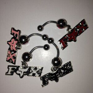 This dangle belly ring has a pink gem at the top and a Fox Racing dangle charm on the bottom that is pink. This is secured with a split ring for security. This is a handmade belly ring.