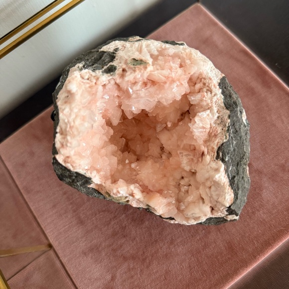 Beautiful pink geode crystal with a rough exterior and sparkling interior.