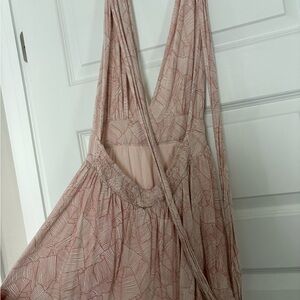 Stylish pink and cream romper with a geometric palm leaf pattern. Features a deep V-neck and halter cut.