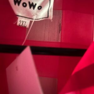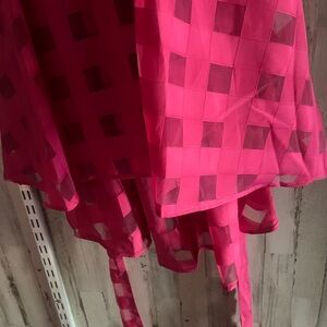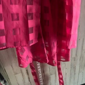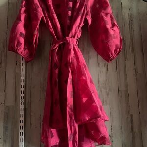 Stylish pink dress with a geometric pattern. Features a tie waist and long sleeves.