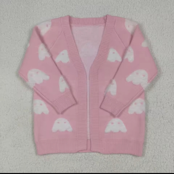 Cute pink cardigan with ghost pattern. Perfect for a cozy look.