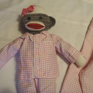 Pink Gingham 2T-3T Pajama set Matching Sock Monkey Toy New Sleepwear. This set is so cute on and lightweight for spring & summer. They come in a bag from factory, not with tags attached. 100% POLYESTER, long sleeves, BUTTON UP TOP WITH POCKET AT CHEST, ELASTIC WAIST PANTS, SOCK MONKEY IS APROX. 16" LONG AND WEARING THE SAME PAJAMAS. PANT WAIST UNSTRETCHED MEASURES 20", INSEAM IS 12". SHIRT LAYING FLAT ARMPIT-ARMPIT MEASURES 12.5",ARMPIT TO WRIST MEASURES 10.5". WHITE SATINY TRIM AT LEG HEMS, WRIST AND COLLAR OF TOP.