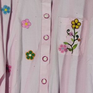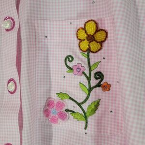 Pink Gingham Check Flannel Top Womens Plus Size 1X Rhinestone Floral Embellished