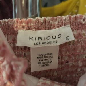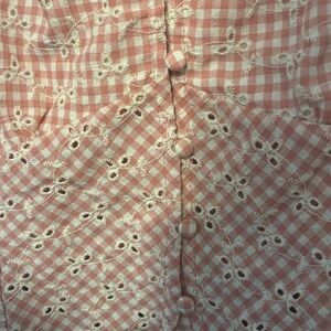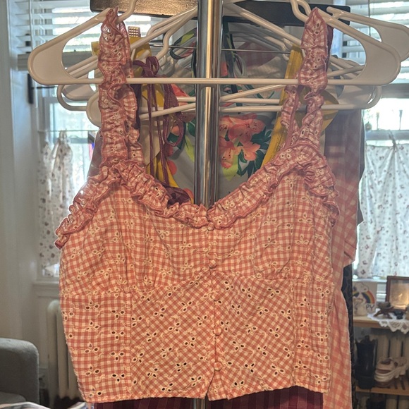Charming pink gingham crop top with ruffle straps. Features a delicate eyelet pattern. Front button closures. Runs small for the busty girls!