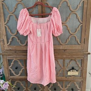 Charming pink gingham dress with puff sleeves. Perfect for a casual day out.