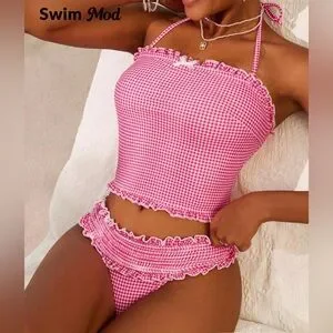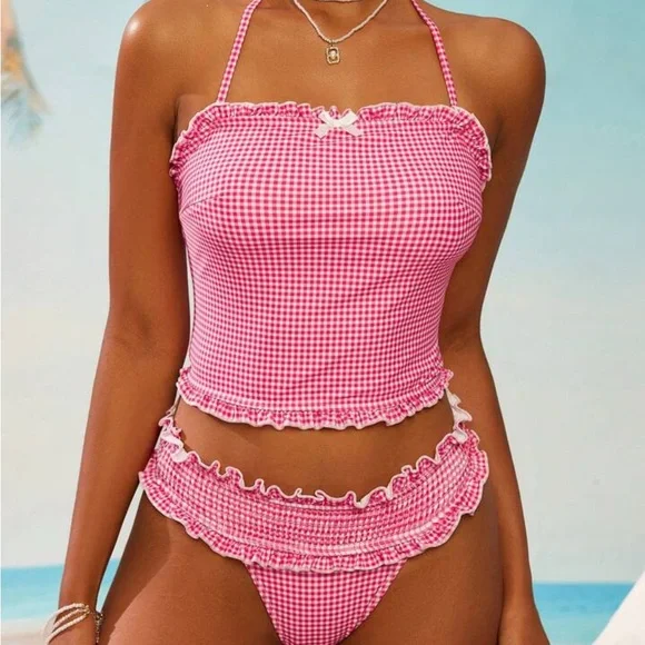 NEW*** Chic pink gingham bikini set with ruffle details. Perfect for a stylish beach day.