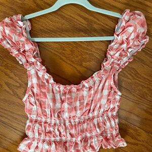 This charming pink gingham ruffle top is perfect for a casual day out. The soft fabric and stylish design make it a must-have in your wardrobe.