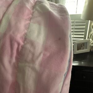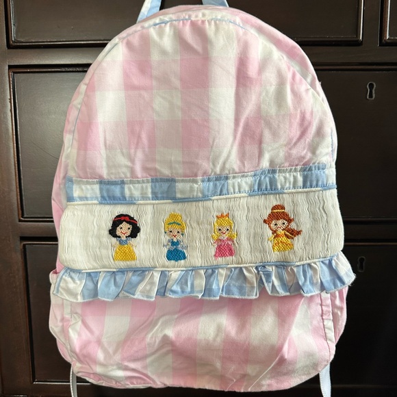 Cute pink and white gingham backpack. Features a ruffled blue trim and a front panel with embroidered character motifs. Soft pastel colors. Fun and playful look for daily use.
