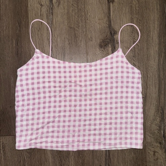 This stylish pink gingham top features delicate spaghetti straps, perfect for a casual day out. Enjoy a comfortable fit with a trendy design.