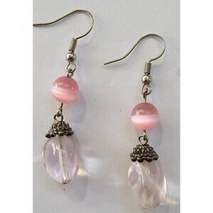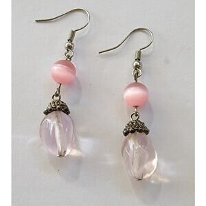 These earrings feature a pink glass bead at the top and a clear pink glass bead at the bottom, connected by a metal cap with an intricate design. The earrings dangle from a metal hook and are approximately 2 inches in length. The clear pink bead has a unique, twisted appearance, adding an elegant touch to the overall design.