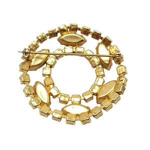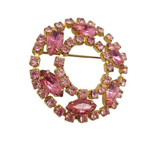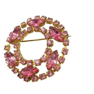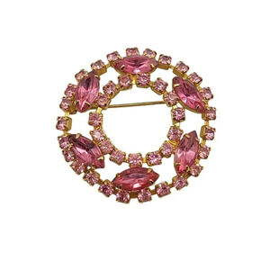 Pink Glass Rhinestone Large Gold Tone Wreath Design Openwork Brooch 2"