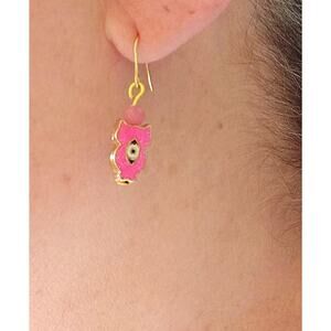 For owl lovers! Owl earrings have glitter pink enamel with evil eye insert. Dangle drop french wire style. Boho bohemian hippie unique. Perfect gift for owl fans spirit animal child girl woman unisex. It is bright pink. 14k Gold plated hypoallergenic. Dainty lightweight minimalist. Free shipping excludes Alaska, Hawaii and international orders.