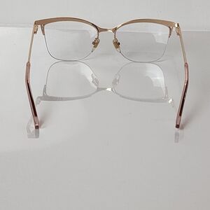 Add a sleek, sophisticated touch to your look with these stylish semi-rimless pink and gold cat-eye eyeglass frames. Featuring a lightweight metal construction, these frames combine rose gold-tone arms with blush pink detailing across the browline for a modern and feminine finish. The elegant cat-eye shape flatters a variety of face shapes, making them a perfect choice for both prescription lenses and blue light blocking upgrades.