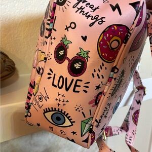 Stylish pink backpack featuring playful graphics and fun prints. Perfect for adding a pop of color to your outfit. Great condition. Perfect for school or travel.