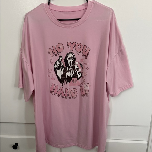 Trendy light pink tee with bold graphic. Ideal for everyday fun.