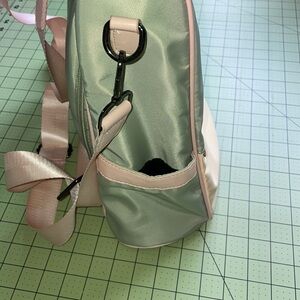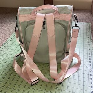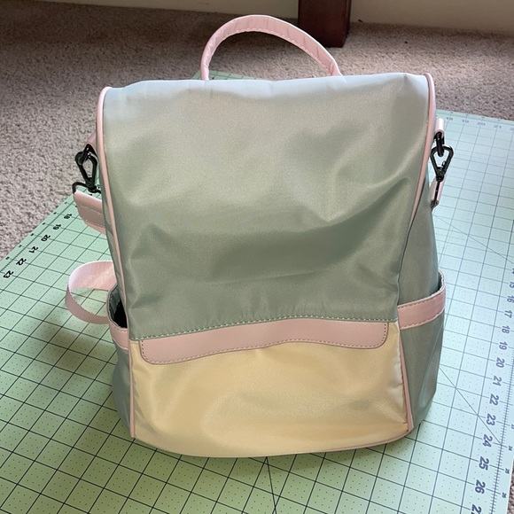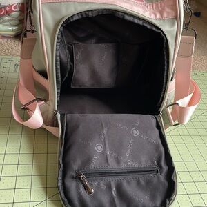 Light gray and light pink backpack with anti-theft opening. Opening from the back rather than the front. Two drink pockets, one front small pocket and inner zippered pocket with small pockets.
