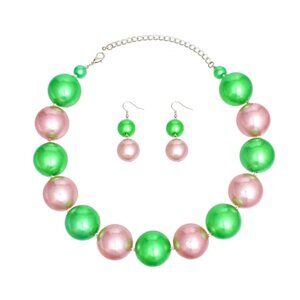 Alpha Kappa Alpha Sorority Paraphernalia Women's Pearl Necklace Set. Jumbo 30mm Pink and Green Acrylic Pearl Single Strand Necklace Featuring Alternating Color Design and Clear Bead Spacers. Silver Metal Lobster Clasp Closure. Includes Matching Double Pearl Drop Fish Hook Earrings. Necklace measures 19 + 3.75 inches