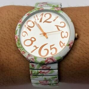 Pink & Green Floral Watch. Fully functional with brand new batteries. Adjustable metal band fits 7 in wrist or near.