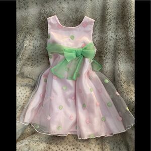 WonderKids presents a charming polka dot organza dress, perfect for toddler formal occasions. Features a layered taffeta and organza gown with a green bow-tied belt. - Brand: WonderKids - Size: 3T - Color: Pink and Green - Fabric: Taffeta, Organza - Fit: Regular - Condition: Pre-loved, cleaned - Care: Store in pet/smoke-free space - Additional: Belt ties in back This item is not new. It is pre-loved so you may see some signs of use. Although all items are cleaned and inspected before listing do check all pictures carefully before purchasing. This item is sold as is. toddler party dress, organza toddler dress, pink green formal dress, polka dot dress 3T, WonderKids formal dress, toddler formal gown, toddler dress, formal toddler outfit, organza dress, party dress, polka dot, green belt, pink dress, wonderkids 3T
