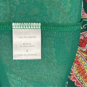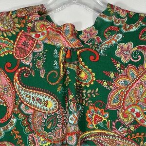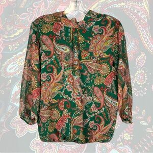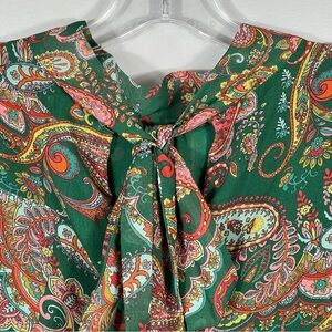 Sweet Pea for New York & Company by Stacy Frati • Paisley Blouse in Shades of Green, Pink, and Red • Women’s Size Small • High Neck • Sash Tie at the Back of Neck