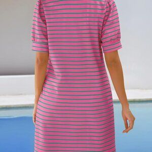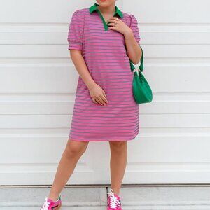 Fresh and fun pink striped dress with green accents, featuring a flattering straight fit and a crisp white polo collar with a V-neckline. Made from soft, lightweight fabric that’s perfect for warm days. The short sleeves and relaxed silhouette make it an easy choice for casual outings, brunch, or a weekend getaway. Style it with sneakers or sandals for a cute and comfortable look.