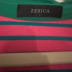 Color: Pink with green stripes, white collar