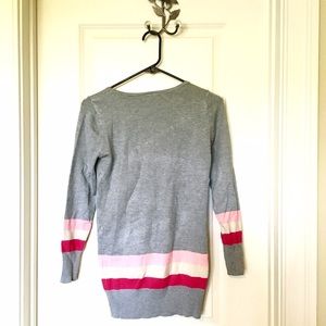 The lower hem sits at lower butt or mid-hip level, depending on height. Can be easily styled with black leggings and a fun, dangly statement necklace!