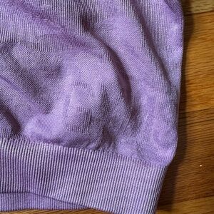 features the gymshark logo on the end of the sleeve, thumbholes, boob scrunch, three hole design on the back and gymshark lettering along the end wrapping around