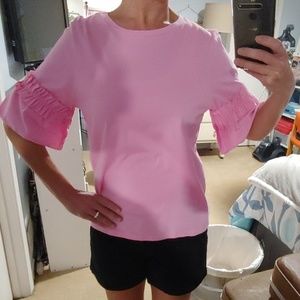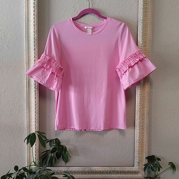 EUC! Super soft, turkish cotton knit with gathered, elastic ruffle trim. Size sm - would also fit size med. Bell sleeve is crafted from a denser broadcloth cotton so the ruffles to hold their shape.