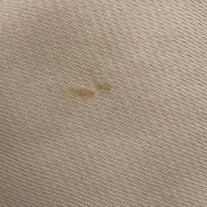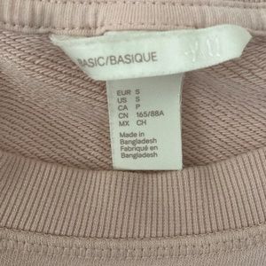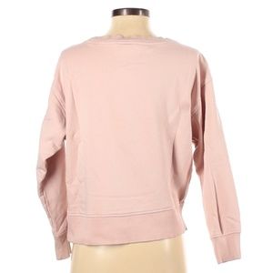 This is a fabulous sweatshirt. Looks fantastic with both dark jeans and light. It's not as thick and bulky as some sweatshirts which makes it great for a fall or spring day and also great for layering. Very laid back feel. Pale pink. It does not pill and is in excellent shape besides a small stain as pictured. The stain is on the front near the bottom.