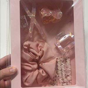 Stylish pink hair accessory set. Includes scrunchies and clips.