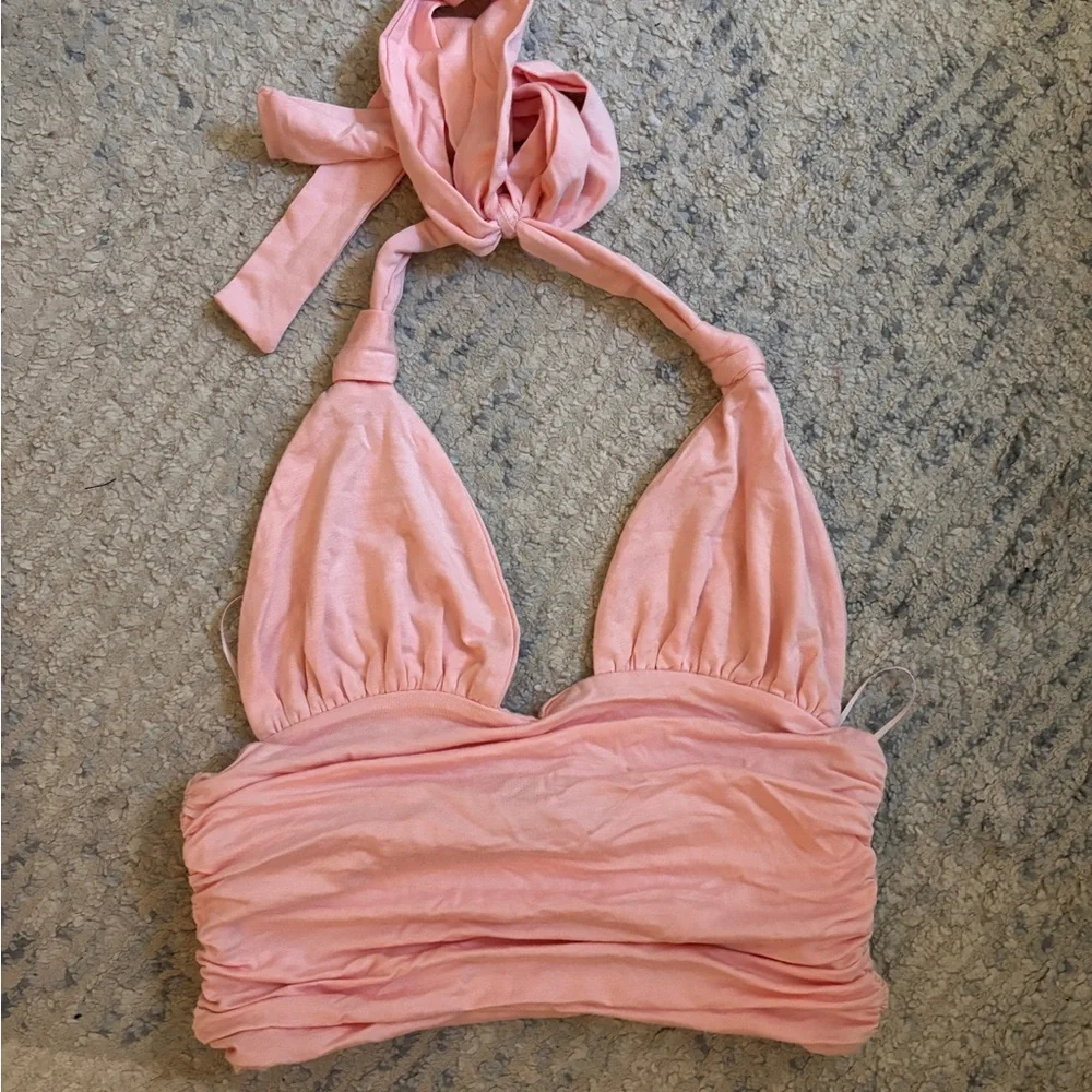 Chic and comfortable pink halter top, perfect for lounging or a casual day out.