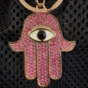 Stylish pink Hamsa hand keychain adorned with sparkling stones. Features gold accents and a secure clasp.