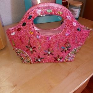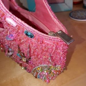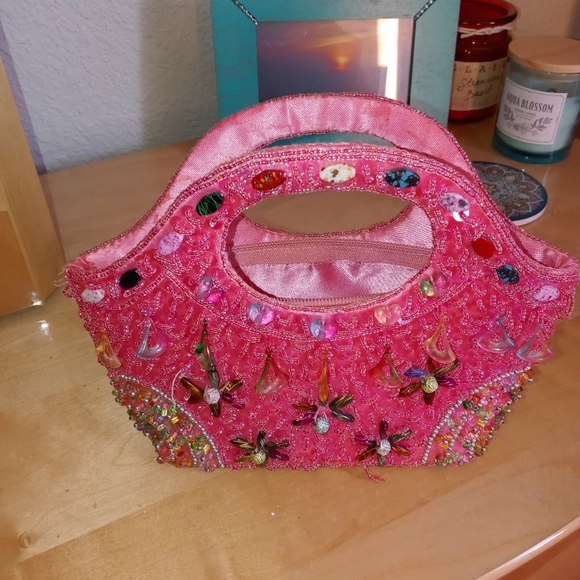 This beaded treasure is great for a night out on the town perfect size to fit your phone and some cash and maybe a little lipstick too. It has a zip inner pocket, snap closure, satin lined with intricate beading. Each bead is a work of art in itself! This was bought in a boutique, used three times, minimal signs of use. It needs to be out on display rather than in a box in my closet. No beads are missing, as seen in images there are slight flaws, just loose strings that may need to be tied and trimmed and some slight water mark/stain near the handle, it can probably be spot washed.