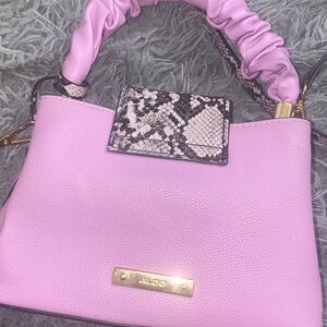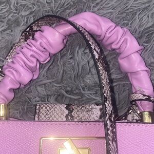 Stylish pink handbag featuring a unique ruched handle and elegant design. Perfect for adding a pop of color to any outfit.